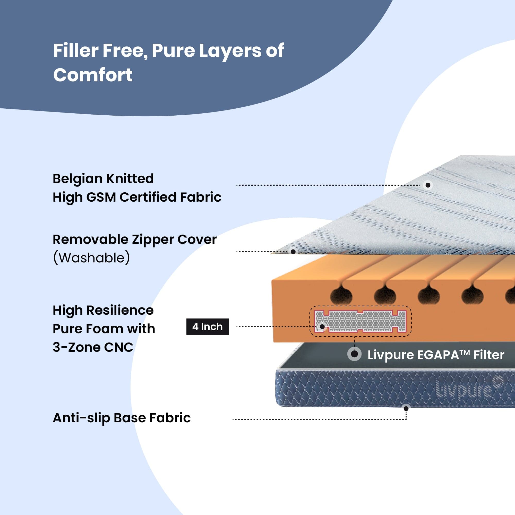 Answer: Foam Mattresses are good for Balanced Support and Comfort and are durable mattress. Livpure has offered advanced innovations in foam to overcome any challenges of foam like the breathable property and allows a sweat free sleep.