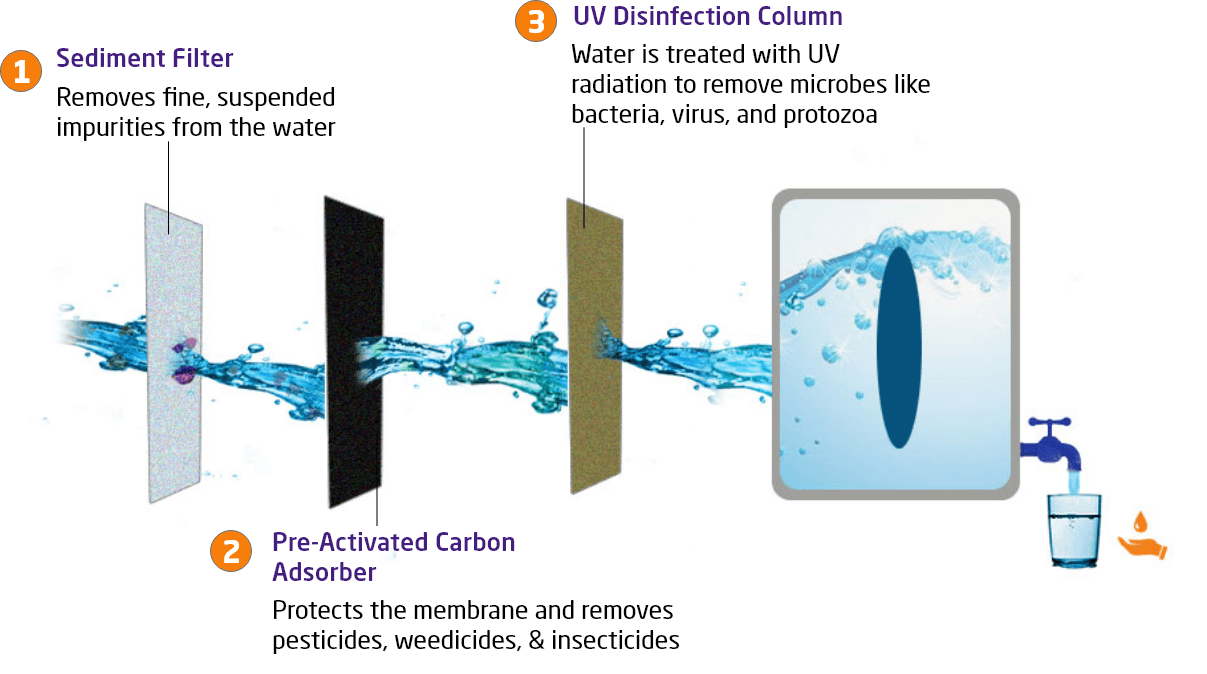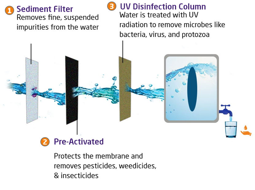 • Purification Cartridges: Sediment Filter, Pre-Activated Carbon Absorber, UV Disinfection Column
