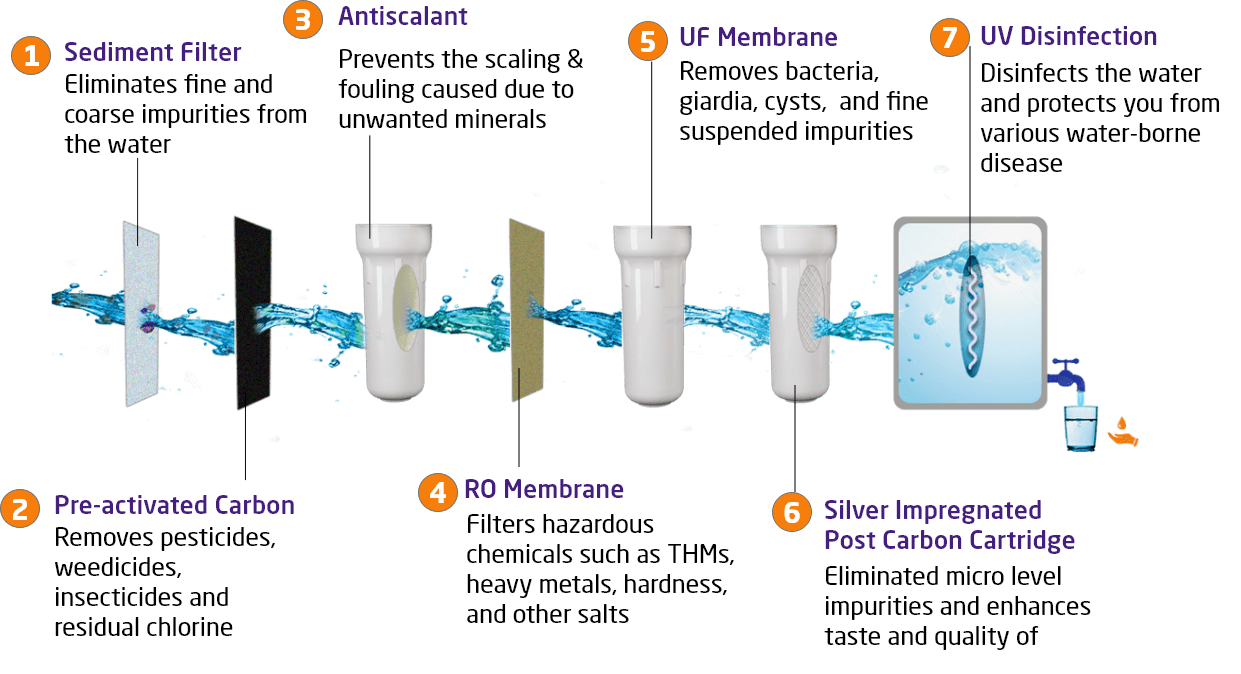 Answer: The Under Counter UTC Neon Water Purifier has an advanced 7 stage filtration process that disinfects and cleans the water keeping it ready for you to drink